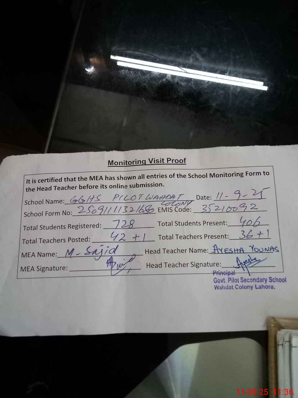 | Remarks (Use Separate Page if Required): 05 classrooms declared dangerous by building department Grass grown up and needs cutting Soaps are less in numbers at hand wash points Three toilets are non functional Present students percentage is 56 35210092 | |||||