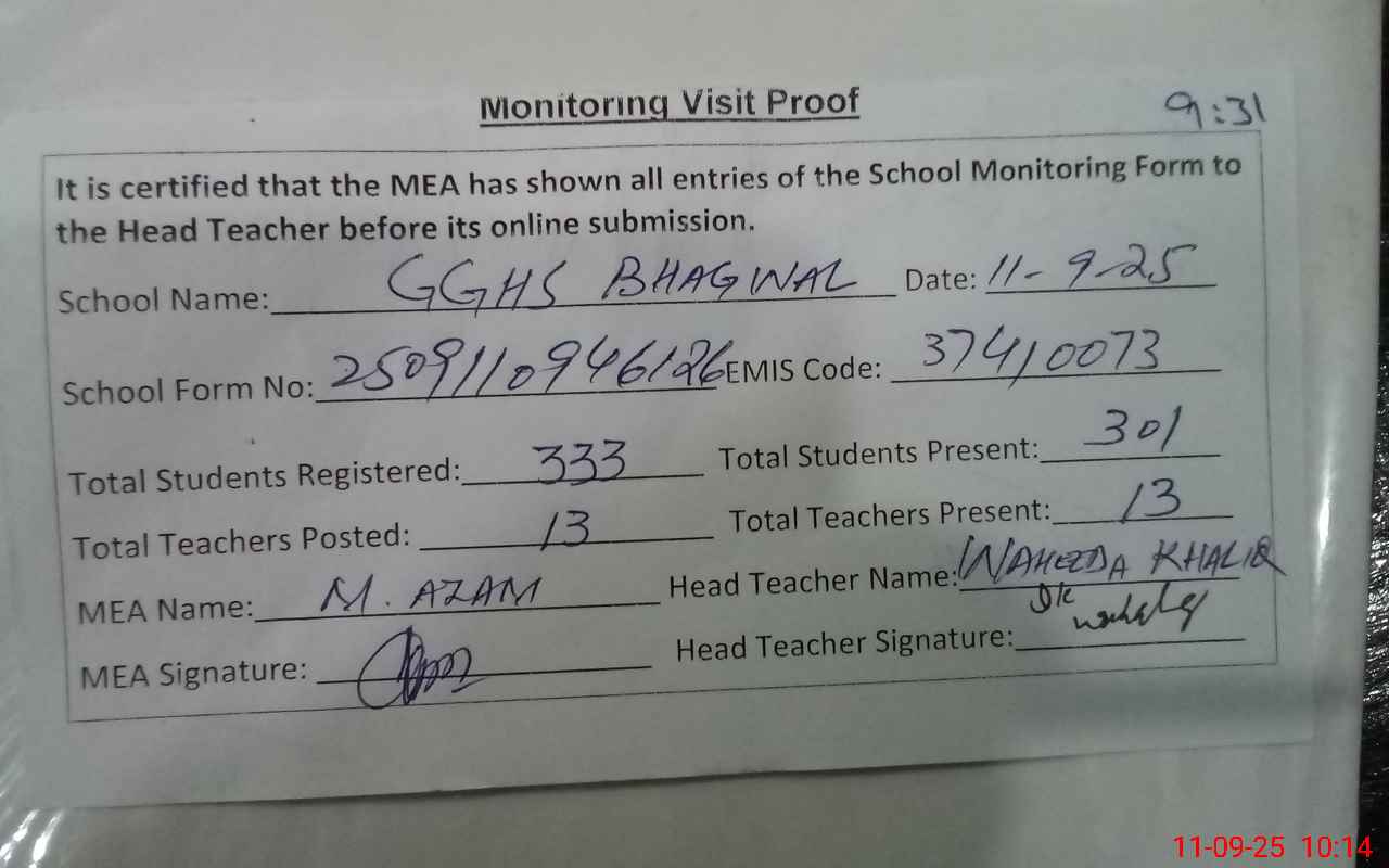 | EMIS Code: 37410073 | Name of School: GGHS BHAGWAL | |||