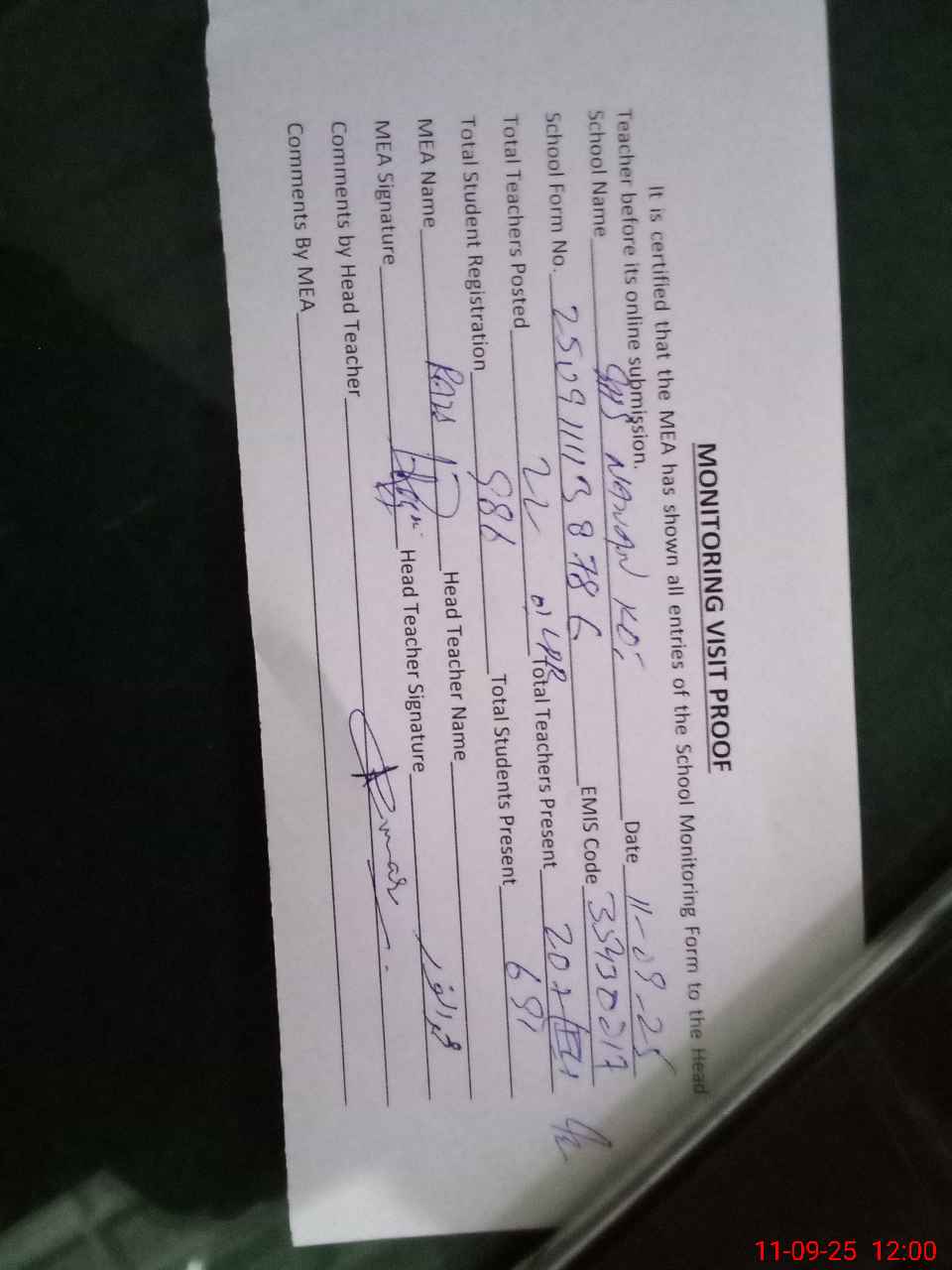 | Attendance Register | Head Teacher | MEA with School | Visit Proof |