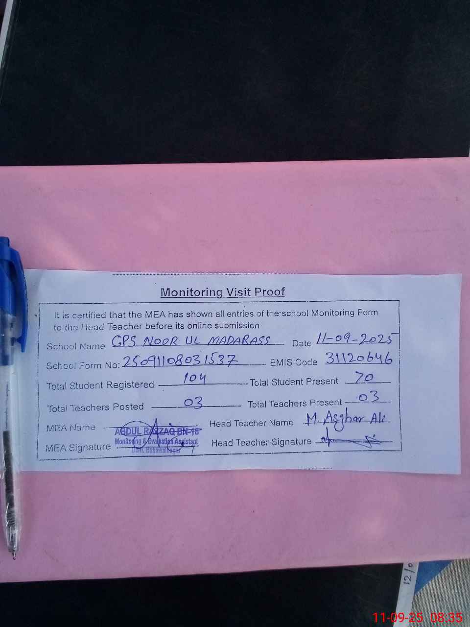 | Attendance Register | Head Teacher | MEA with School | Visit Proof |