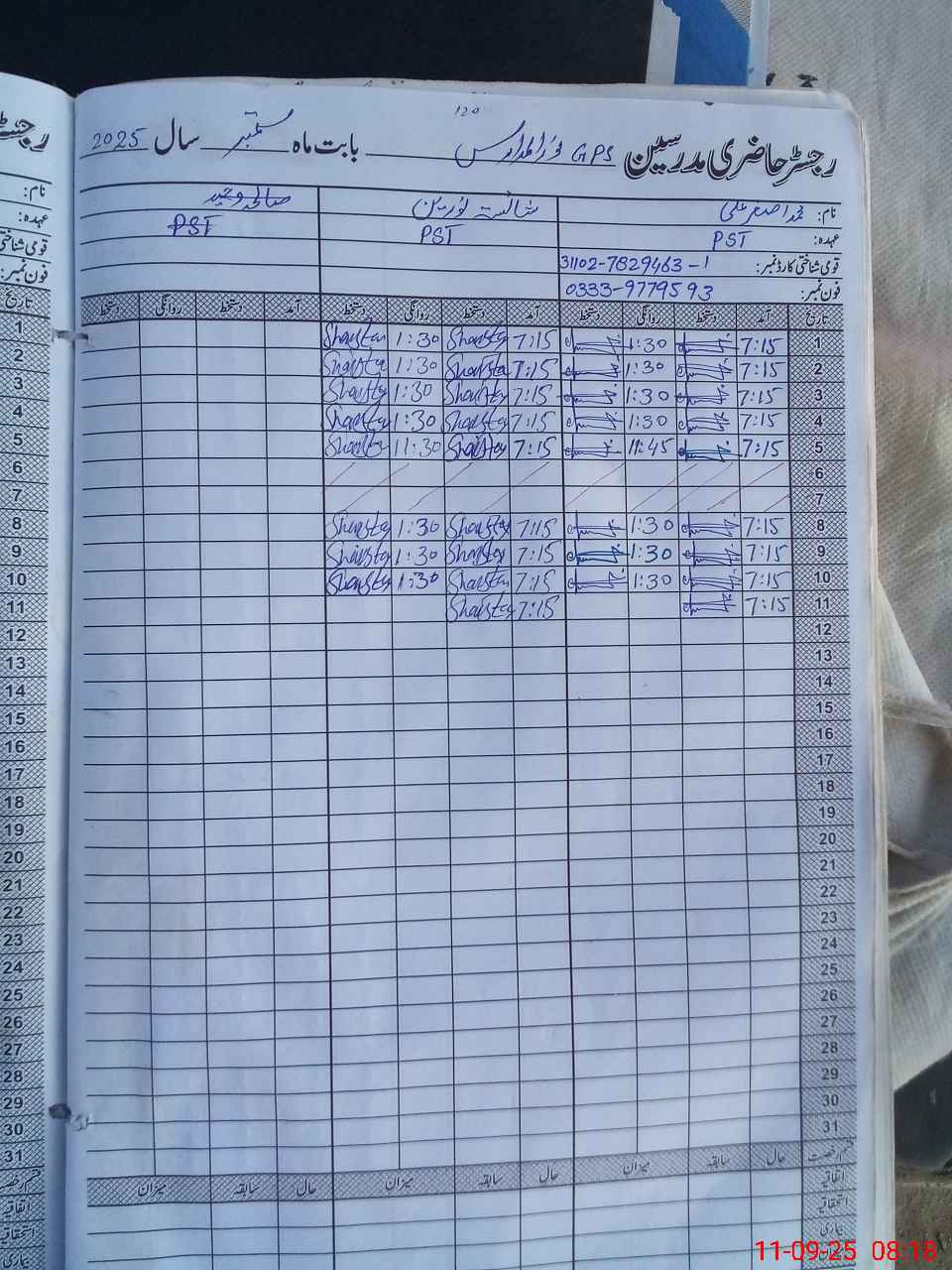 | CNIC | Full Name | Designation | R/C | Absence during last cal. month |