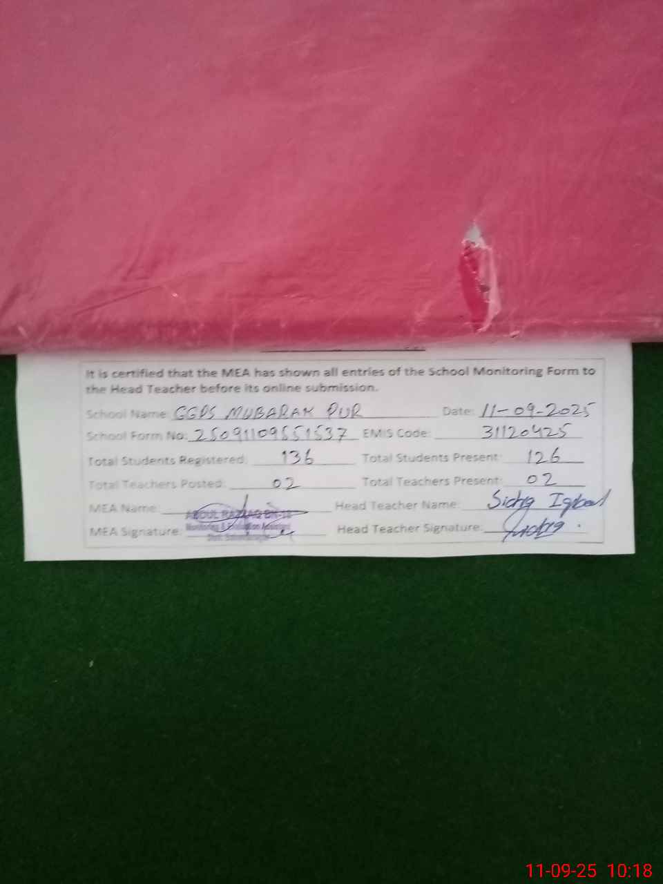 | EMIS Code: 31120425 | Name of School: GGPS MUBARAK PUR | |||