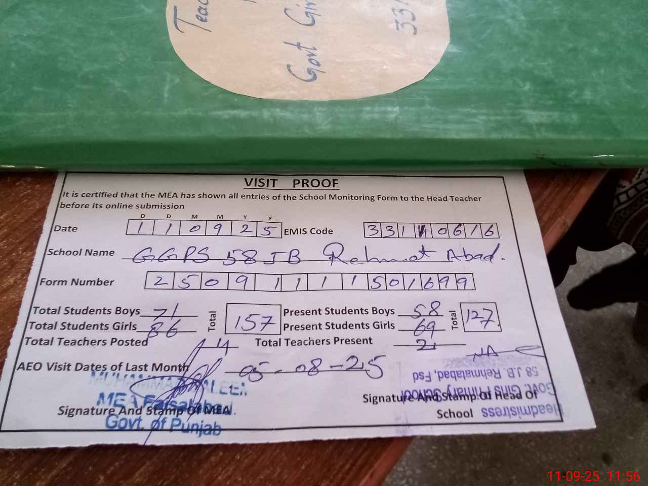 | Attendance Register | Head Teacher | MEA with School | Visit Proof |