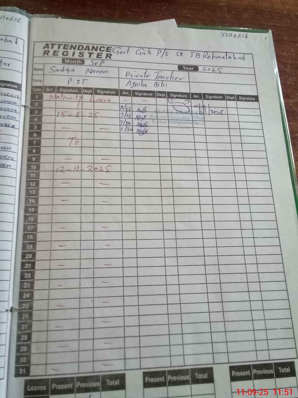 | 33**** | Sa**** Na**** | PST | Regular | 0 | 0 | 0 | 0 | 0 | 0 | 0 | 0 | 0 | Maternity |