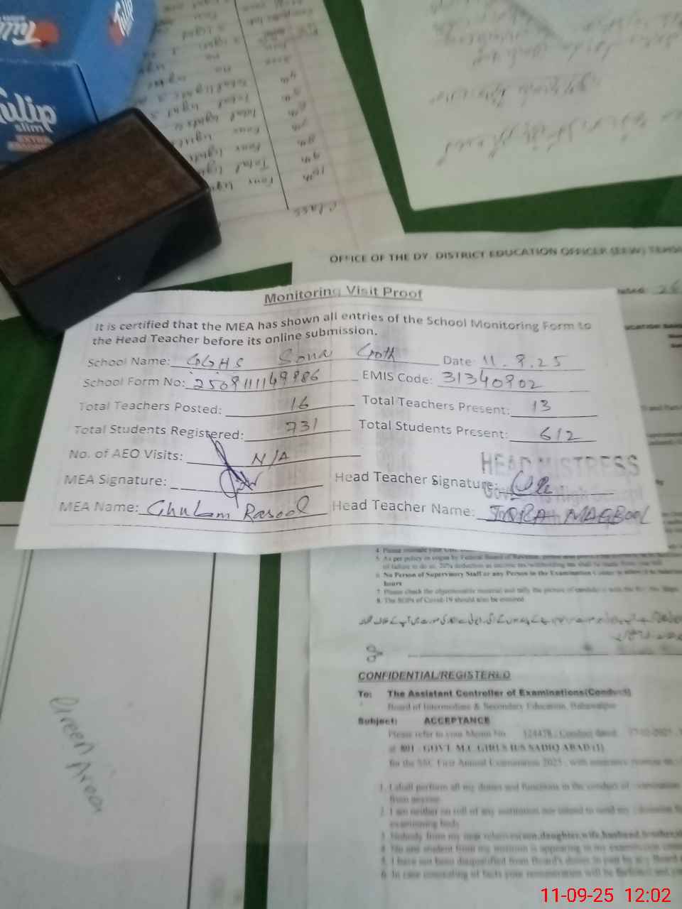 | Attendance Register | Head Teacher | MEA with School | Visit Proof |