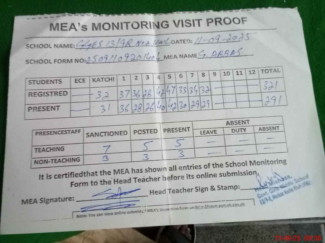 | Attendance Register | Head Teacher | MEA with School | Visit Proof |