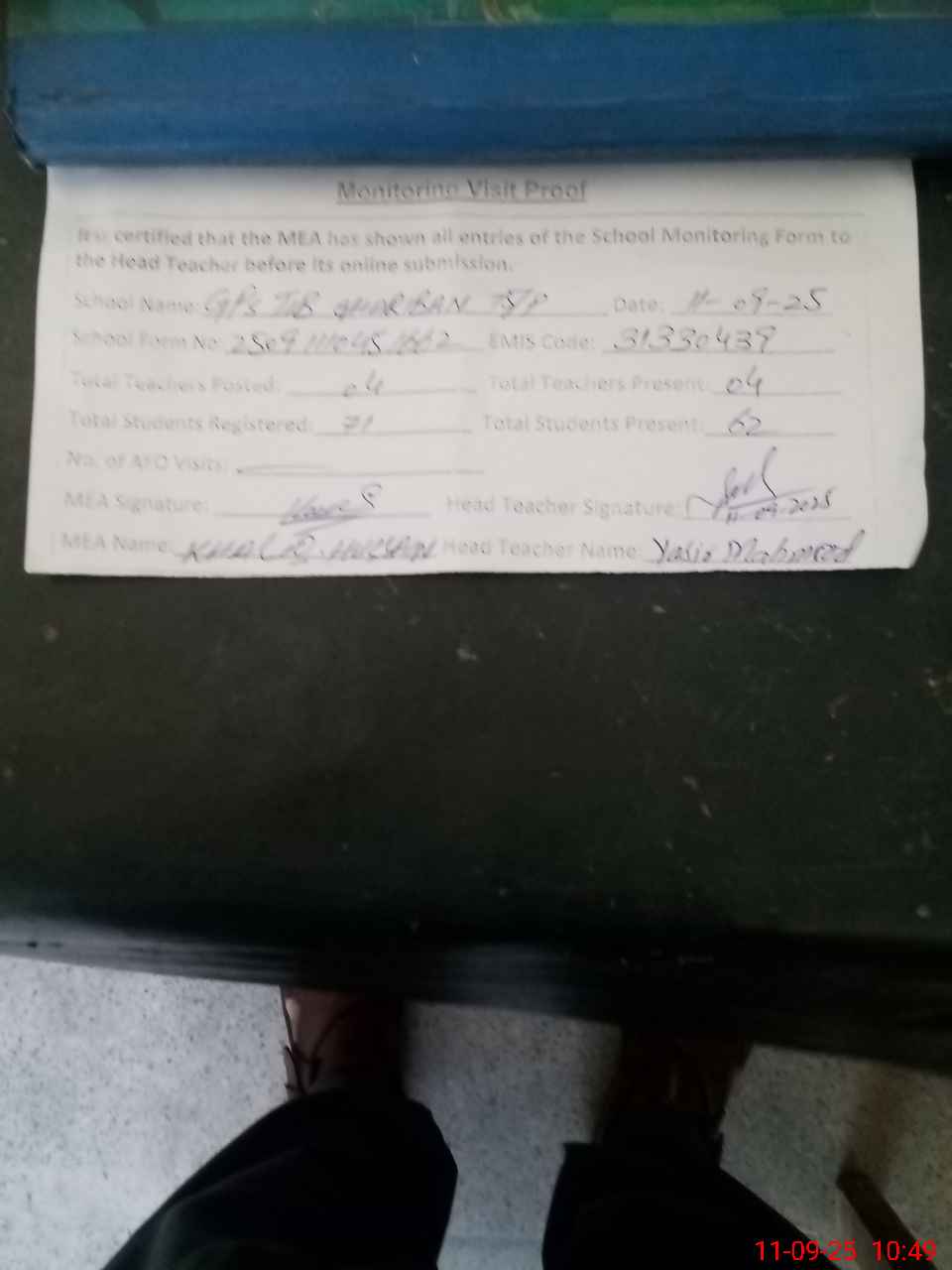 | Attendance Register | Head Teacher | MEA with School | Visit Proof |
