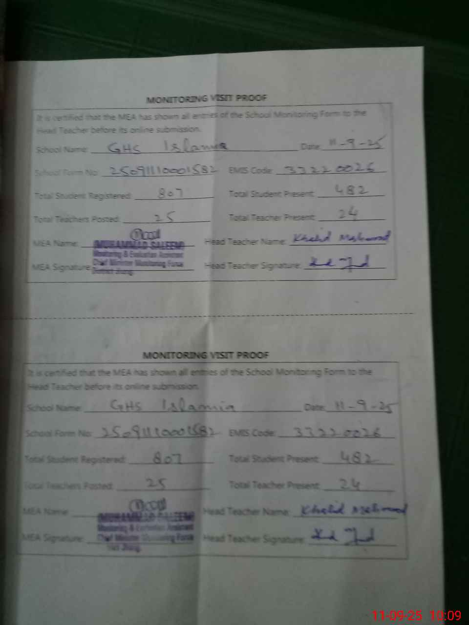 | Attendance Register | Head Teacher | MEA with School | Visit Proof |