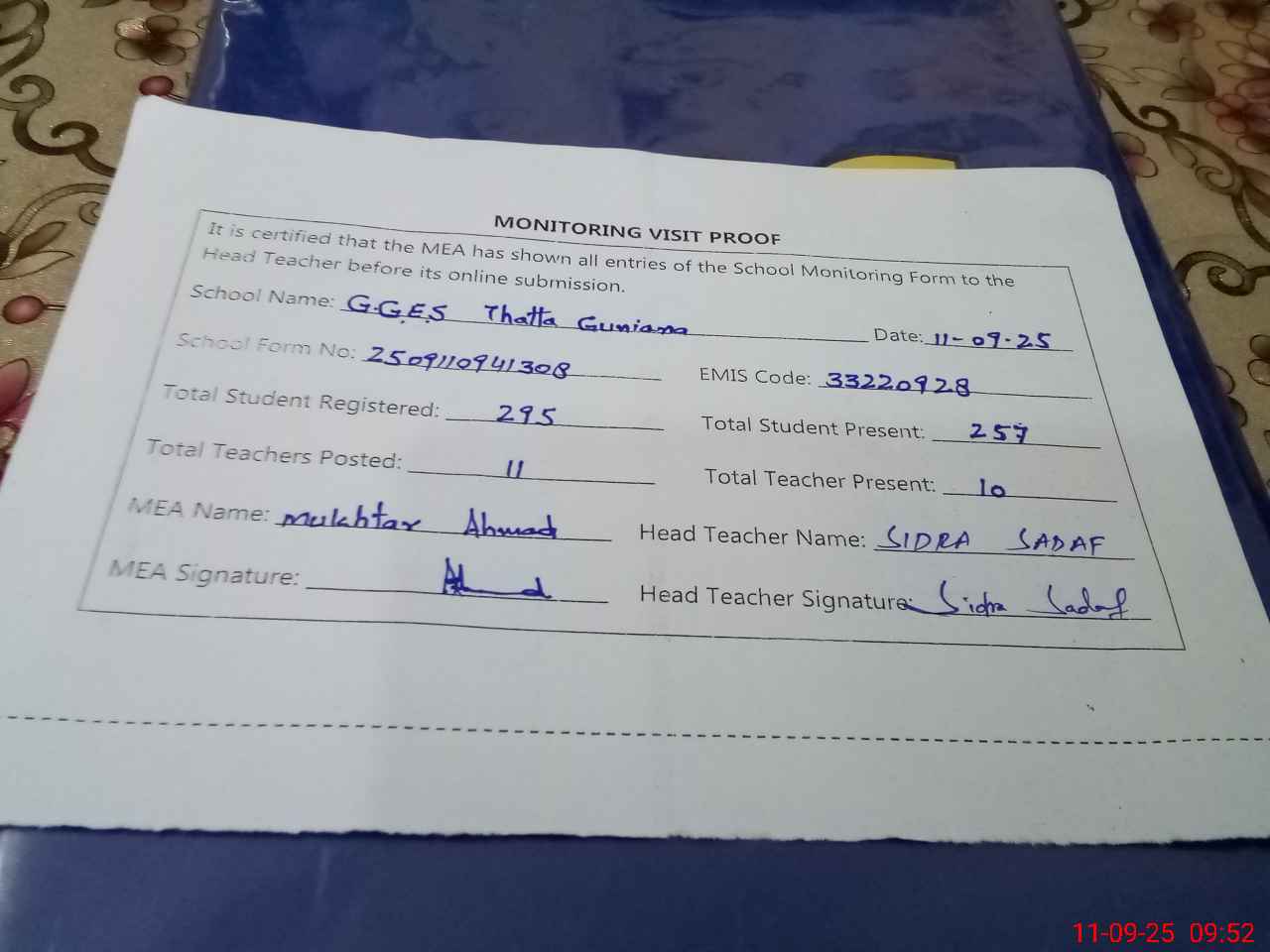| Monitoring Date: 11-09-2025 | Start Time: 11-09-2025 08:55 AM | End Time: 11-09-2025 09:52 AM | Name of MEA: J-**** MU**** AH**** | |