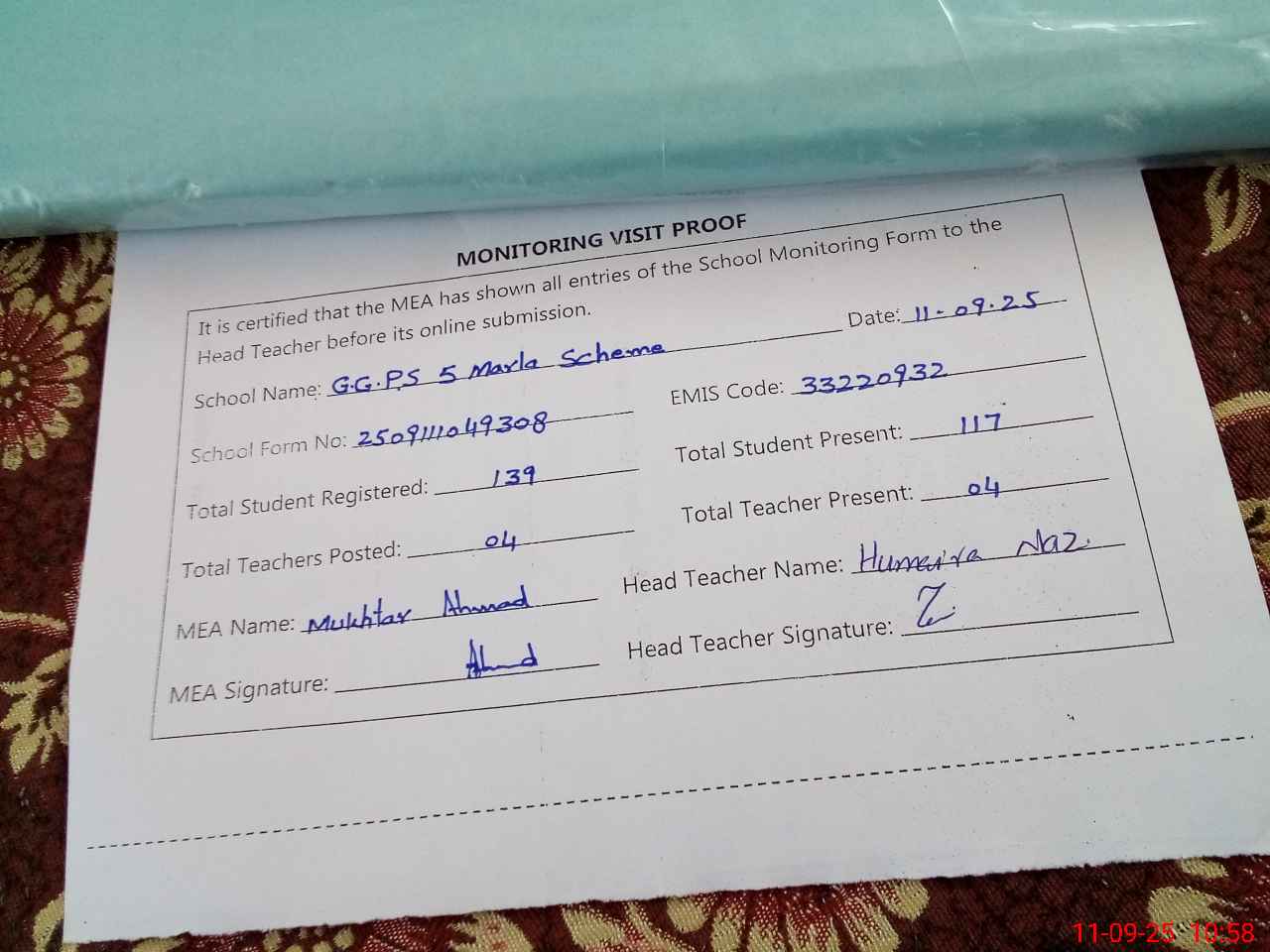 | Attendance Register | Head Teacher | MEA with School | Visit Proof |