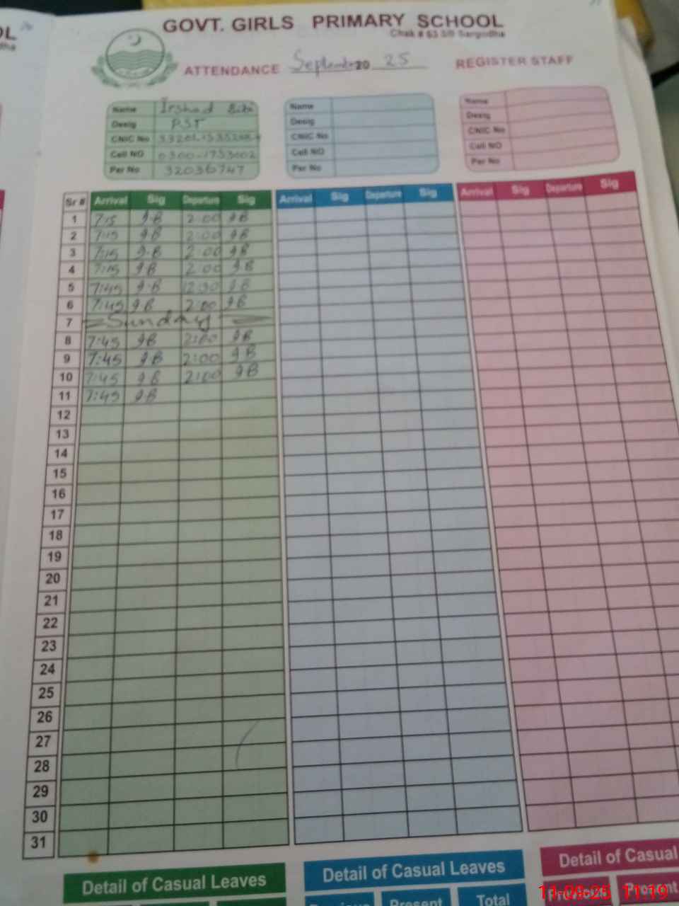 | CNIC | Full Name | Designation | R/C | Absence During Last Calender Month |