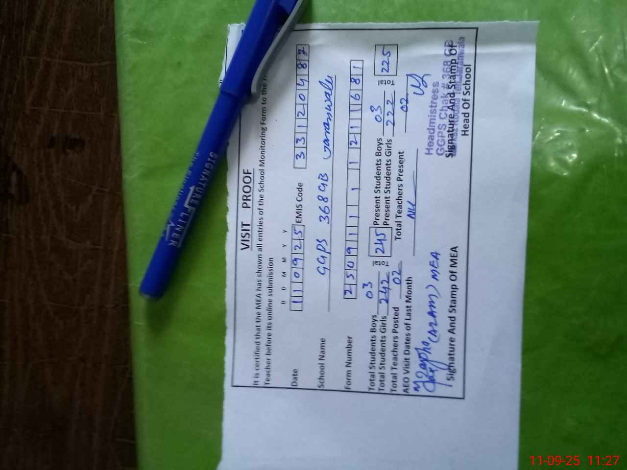 | Attendance Register | Head Teacher | MEA with School | Visit Proof |