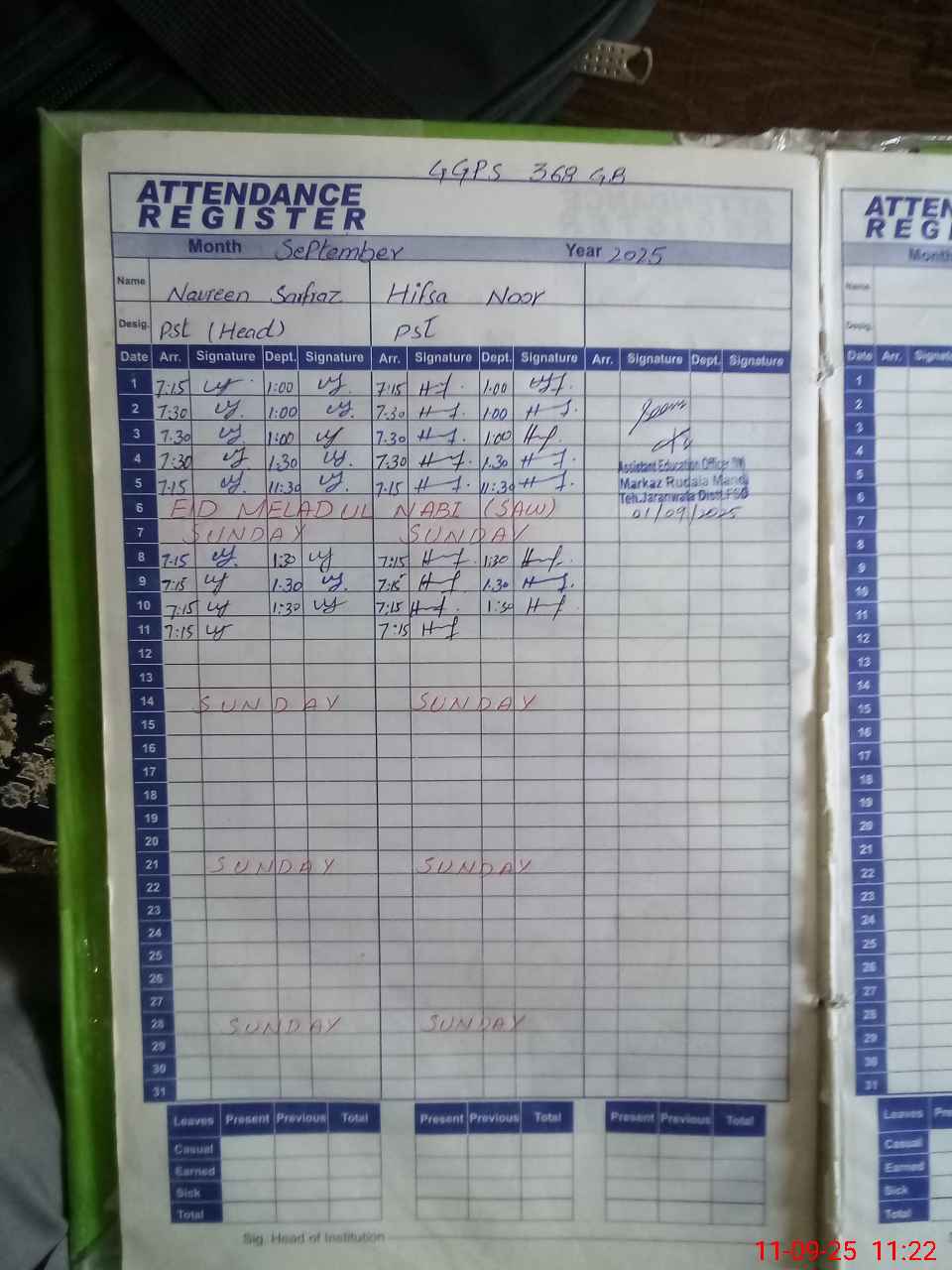 | Monitoring Date: 11-09-2025 | Start Time: 11-09-2025 10:51 AM | End Time: 11-09-2025 11:28 AM | Name of MEA: MU**** AZ**** | |