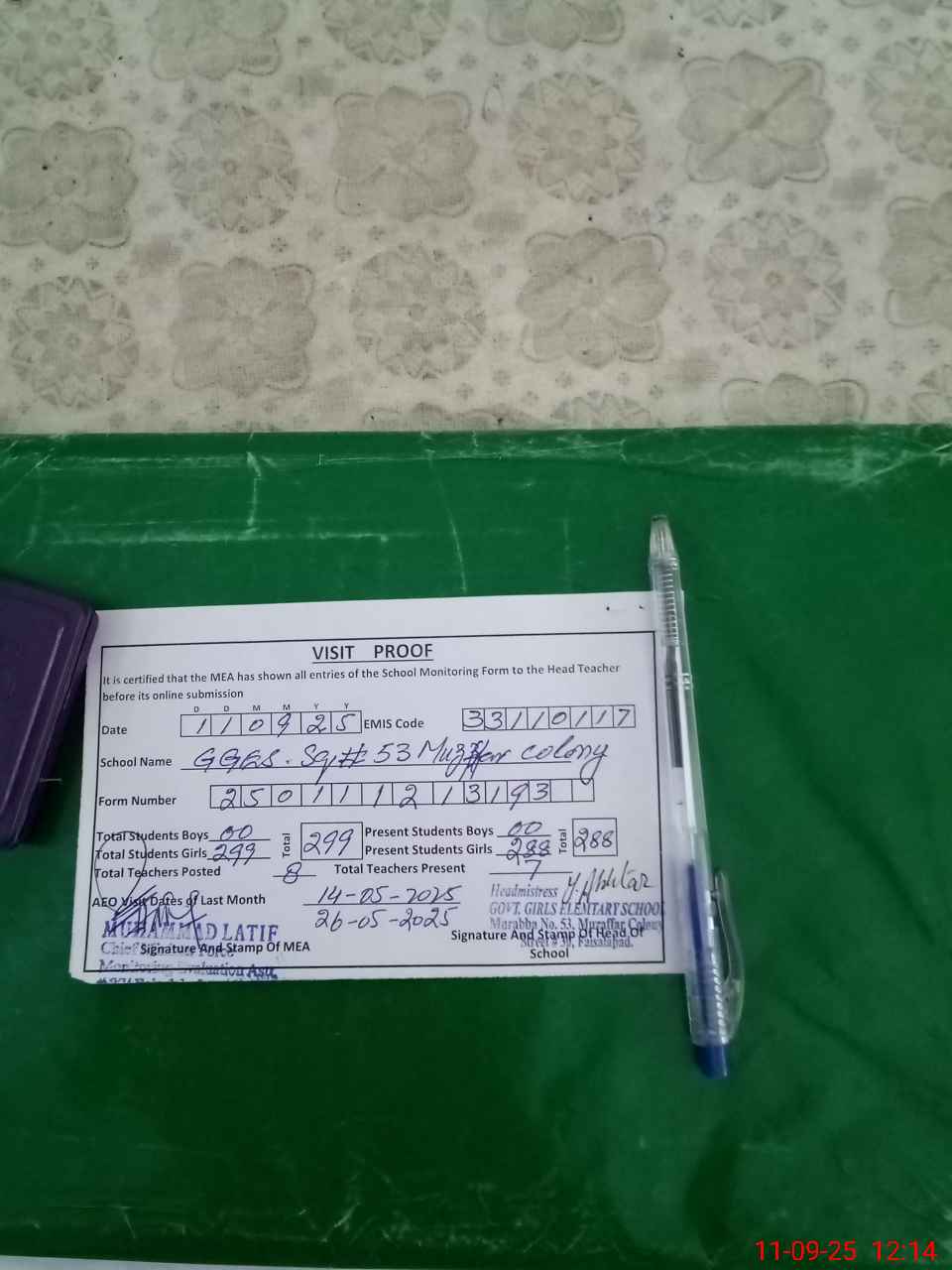 | Attendance Register | Head Teacher | MEA with School | Visit Proof |