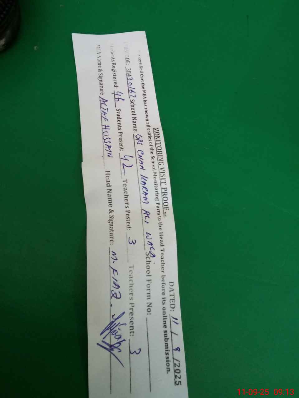 | Monitoring Date: 11-09-2025 | Start Time: 11-09-2025 09:01 AM | End Time: 11-09-2025 09:13 AM | Name of MEA: AL**** HU**** | |