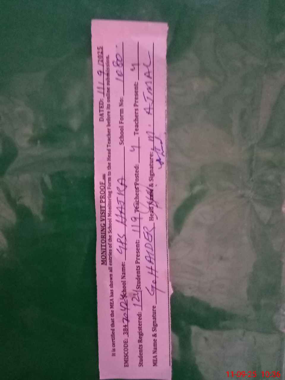 | Attendance Register | Head Teacher | MEA with School | Visit Proof |