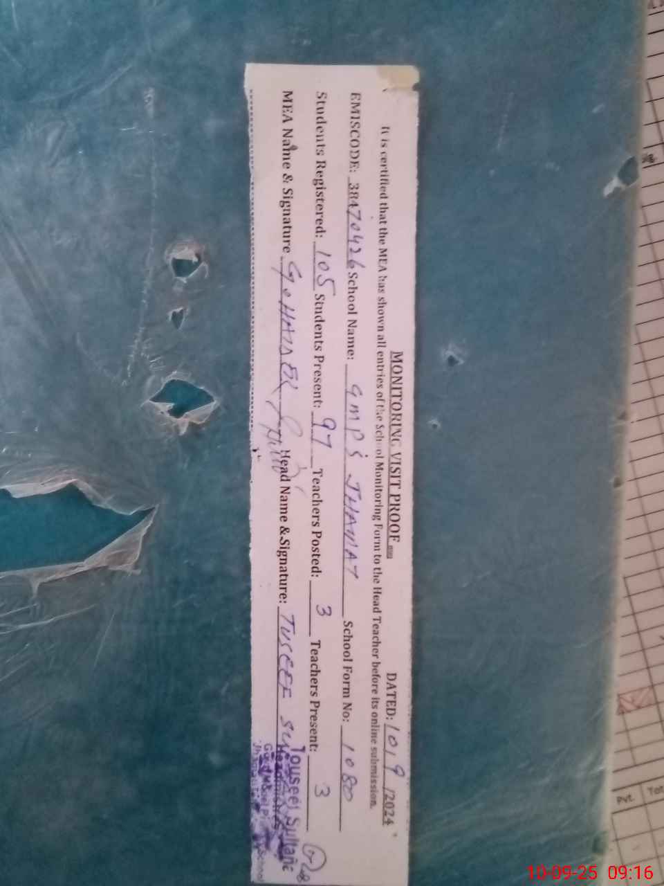| Monitoring Date: 10-09-2025 | Start Time: 10-09-2025 09:00 AM | End Time: 10-09-2025 09:30 AM | Name of MEA: GH**** HA**** | |
