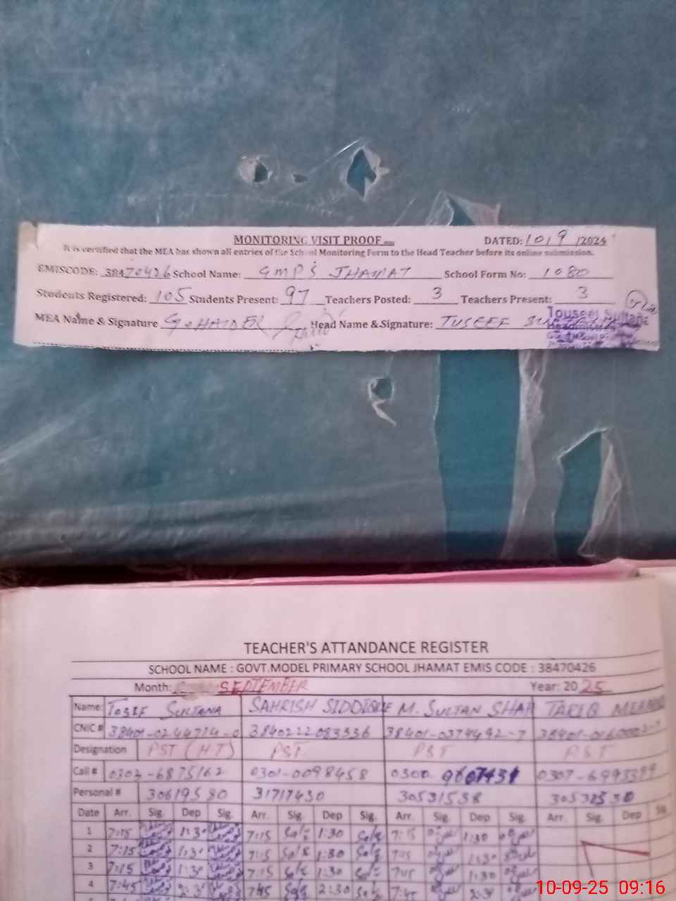 | Attendance Register | Head Teacher | MEA with School | Visit Proof |