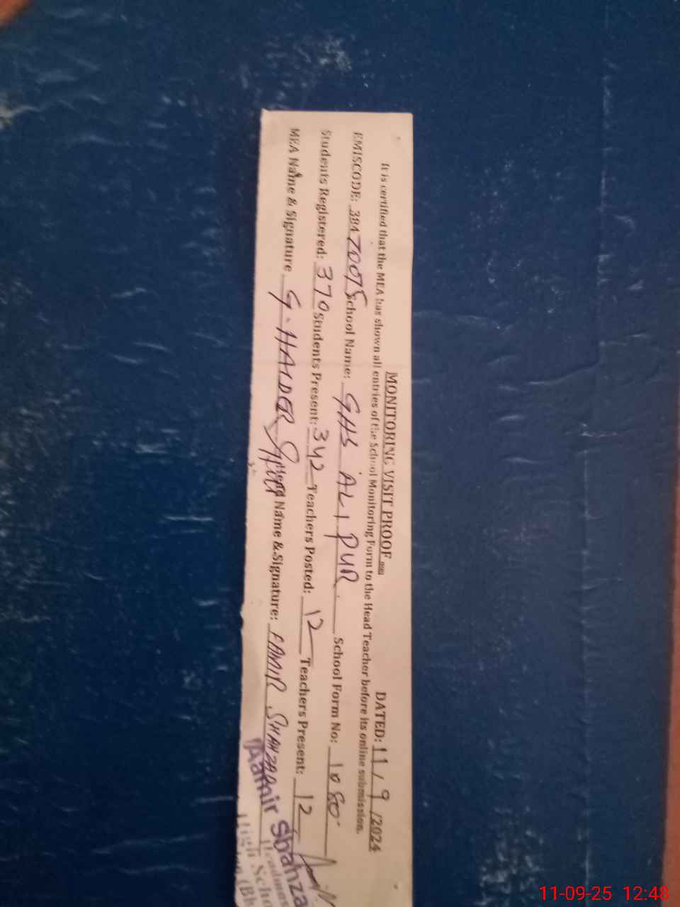| Certified that this School was Inspected by the Undersigned MEA/DMO Today and the Information Stated Above is as Per Record. | |||||