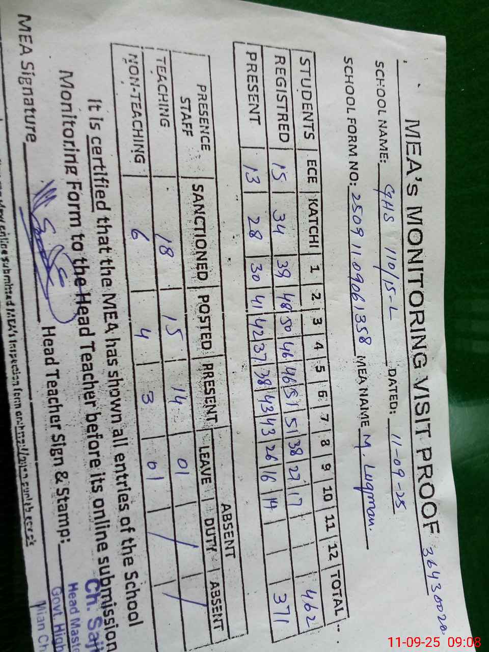 | Attendance Register | Head Teacher | MEA with School | Visit Proof |