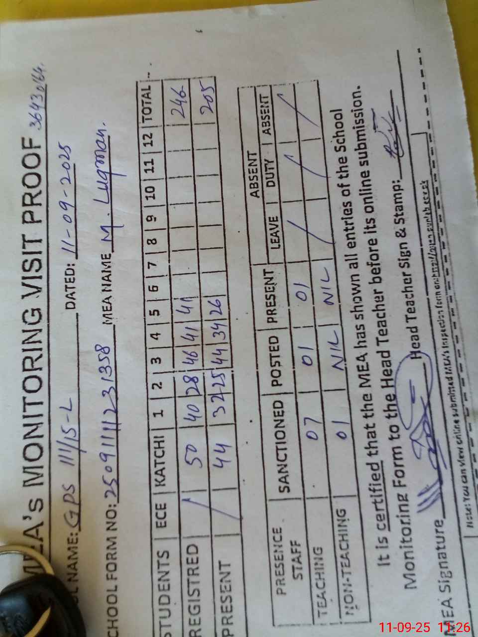 | Attendance Register | Head Teacher | MEA with School | Visit Proof |