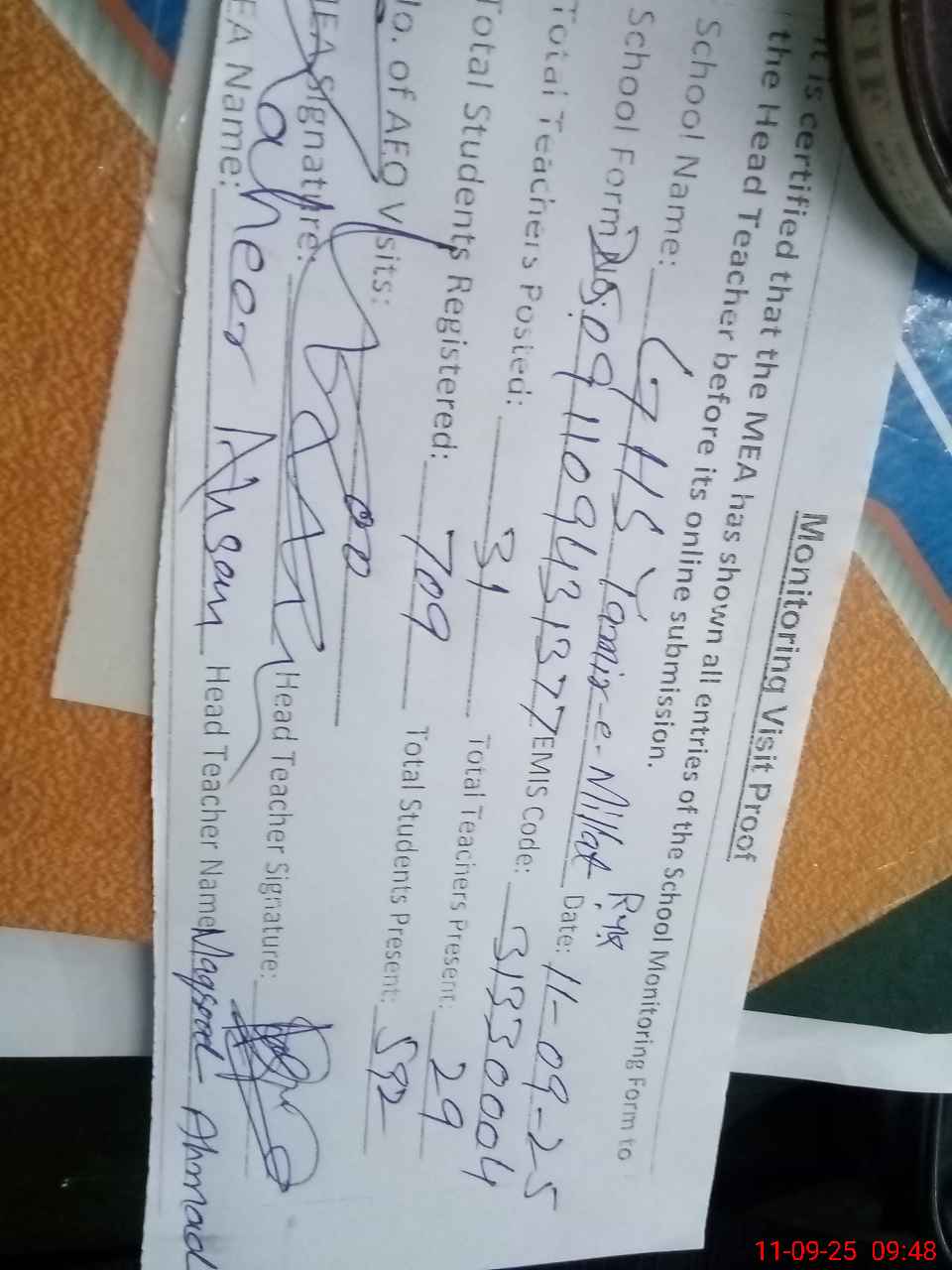 | Attendance Register | Head Teacher | MEA with School | Visit Proof |