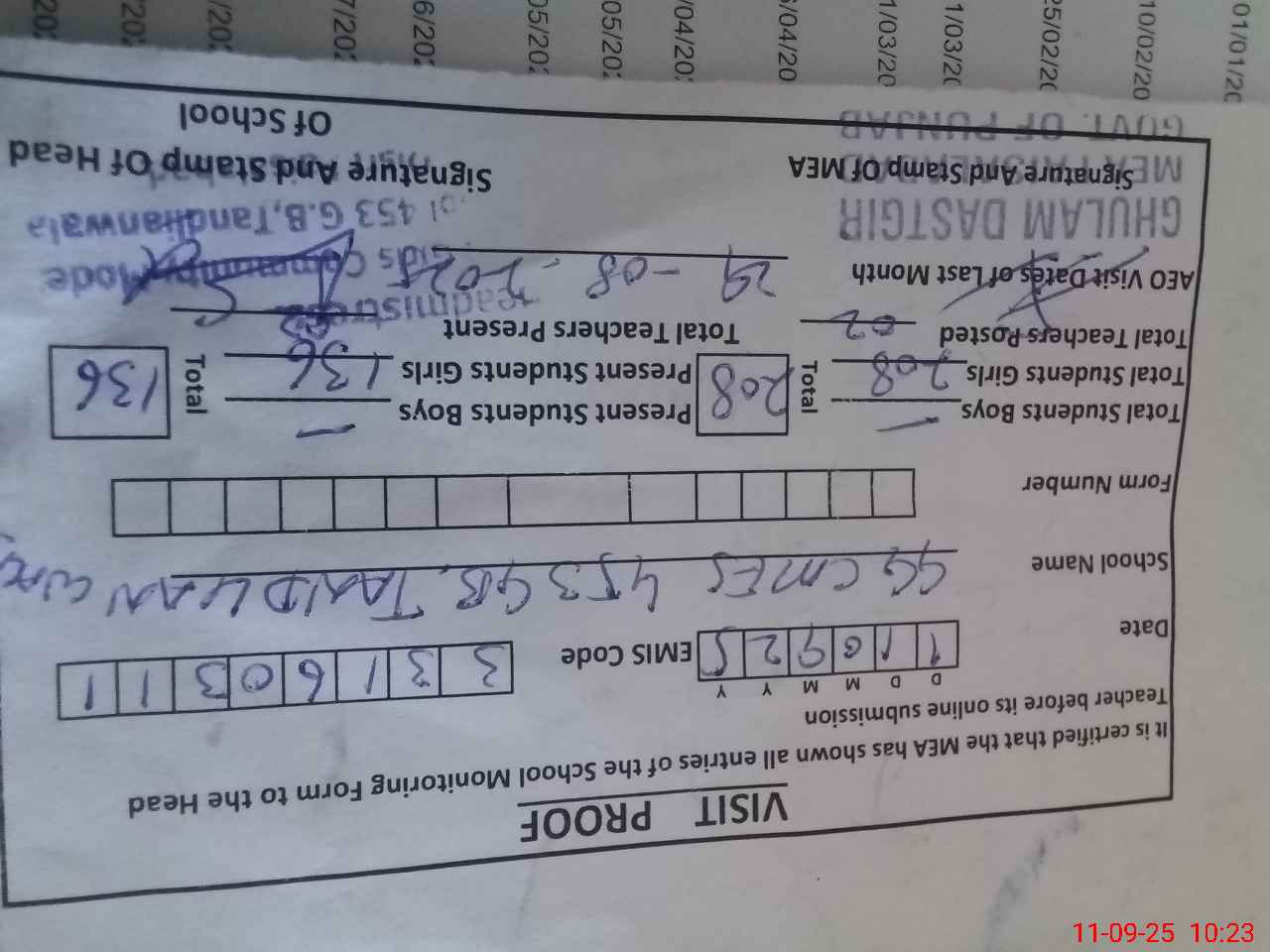 | Attendance Register | Head Teacher | MEA with School | Visit Proof |
