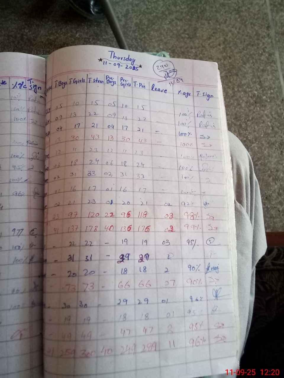 | Total Students Present | 15 | 0 | 43 | 23 | 24 | 33 | 17 | 21 | 19 | 29 | 18 | 29 | 19 | 290 | ||