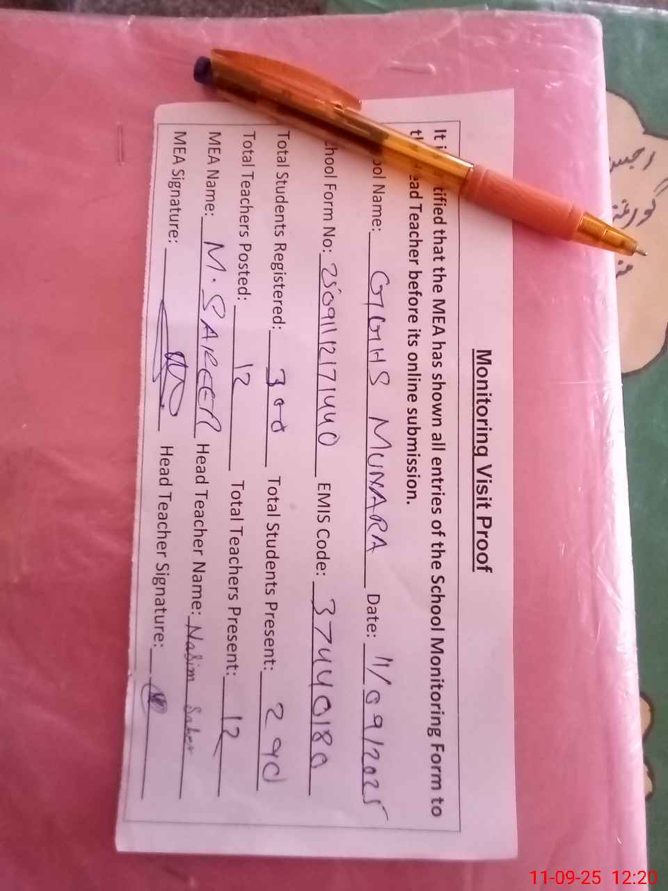 | Attendance Register | Head Teacher | MEA with School | Visit Proof |