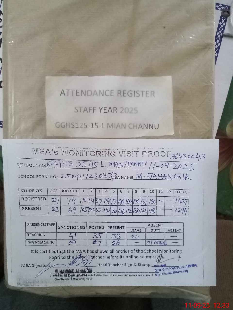 | EMIS Code: 36430043 | Name of School: GGHS 125/15-L, MIAN CHANNU | |||