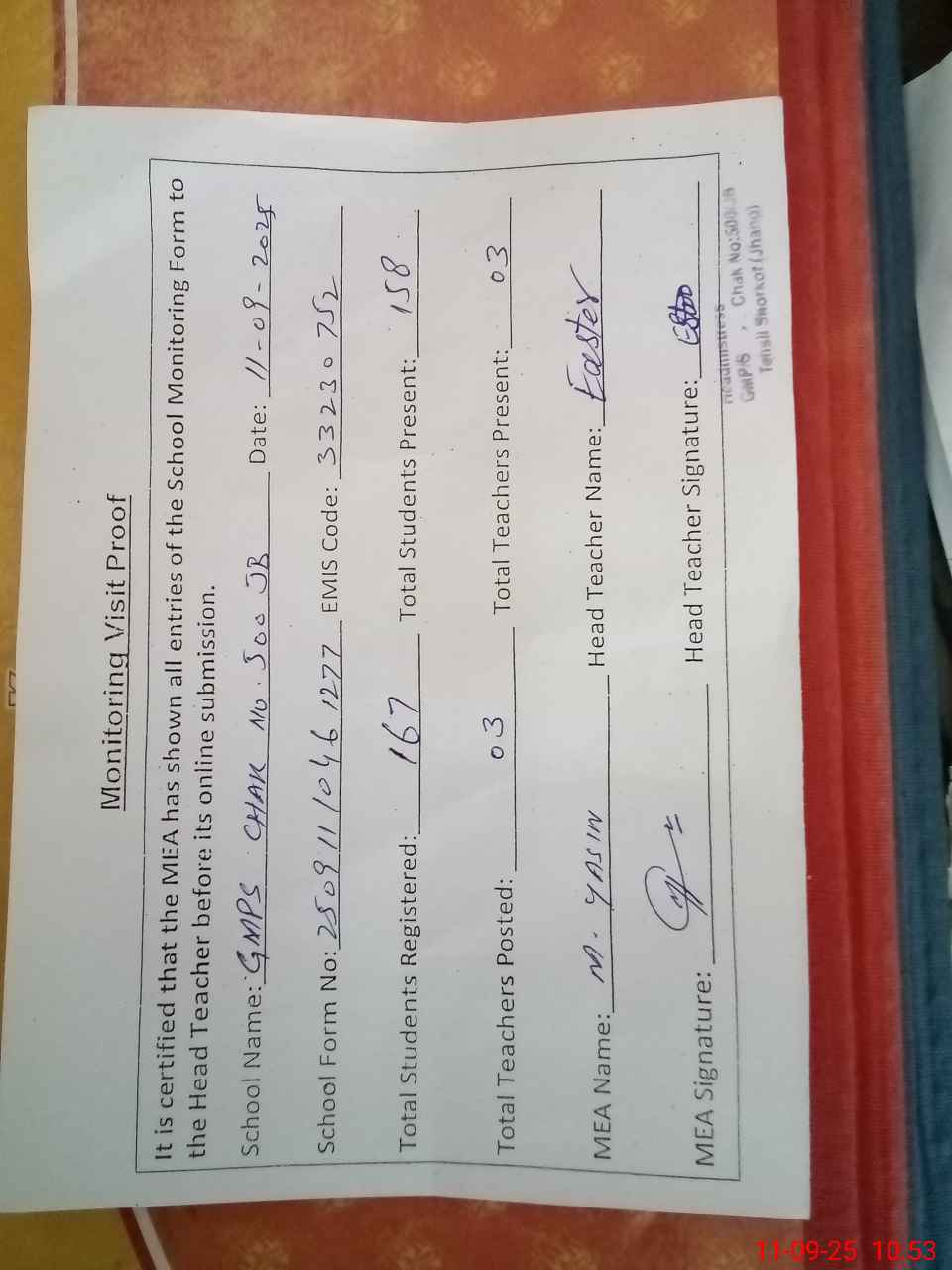 | EMIS Code: 33230752 | Name of School: GMPS CHAK NO. 500 JB | |||