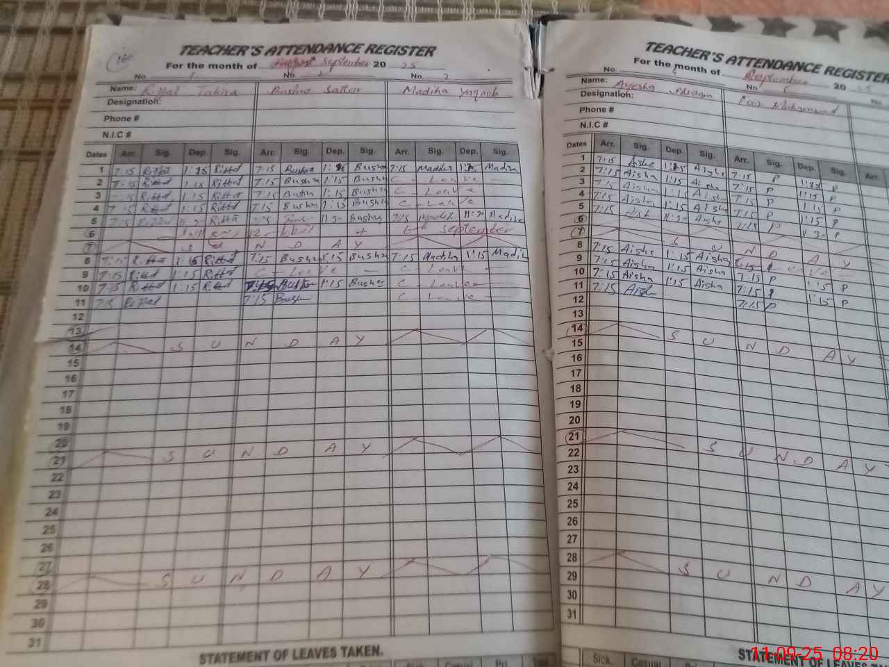 | CNIC | Full Name | Designation | R/C | Absence During Last Calender Month |