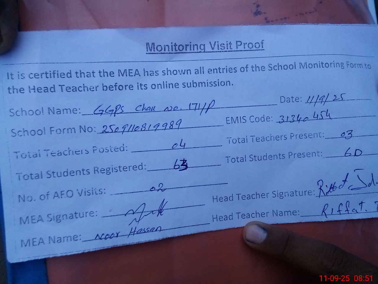 | Attendance Register | Head Teacher | MEA with School | Visit Proof |