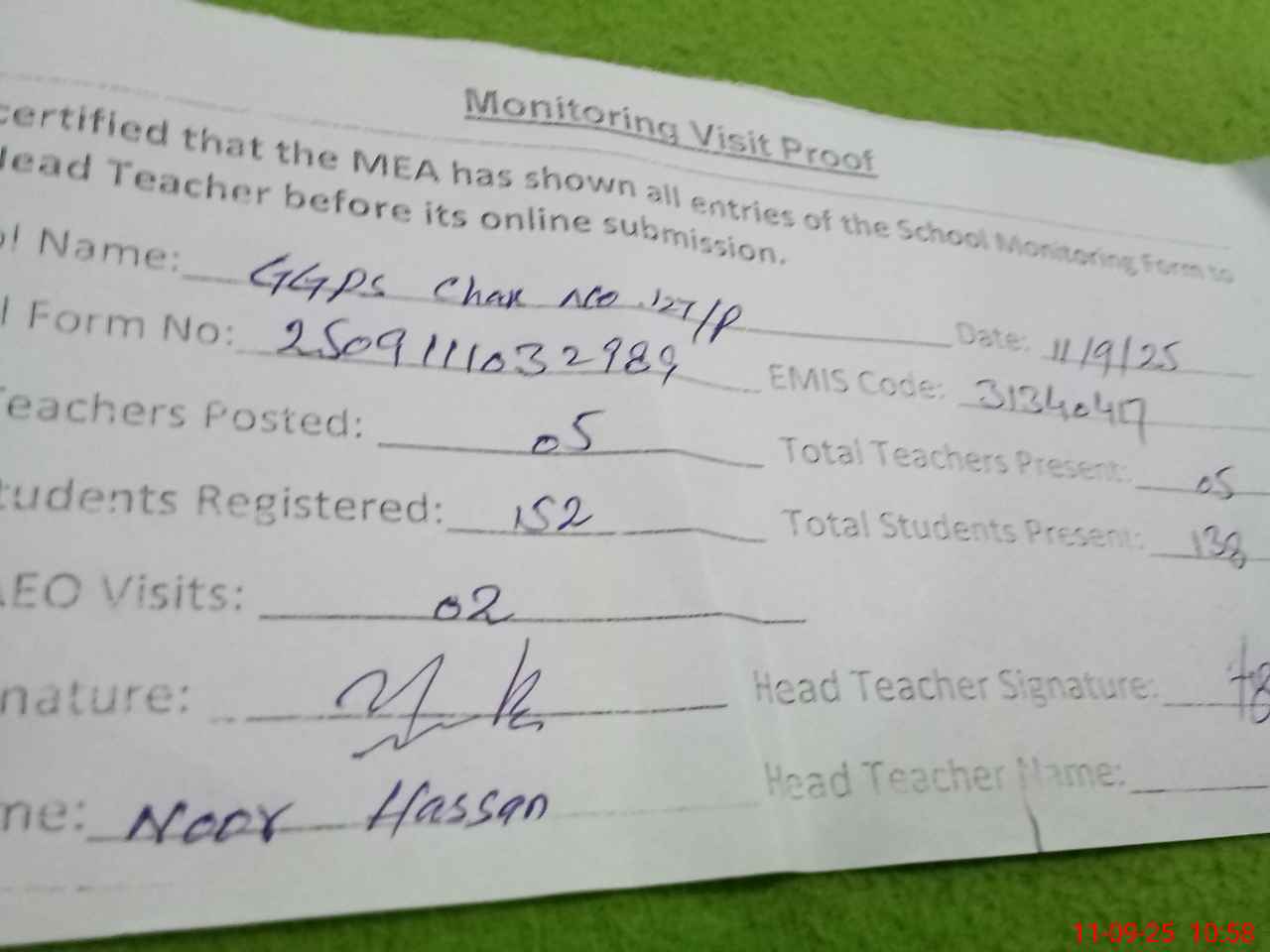 | Attendance Register | Head Teacher | MEA with School | Visit Proof |