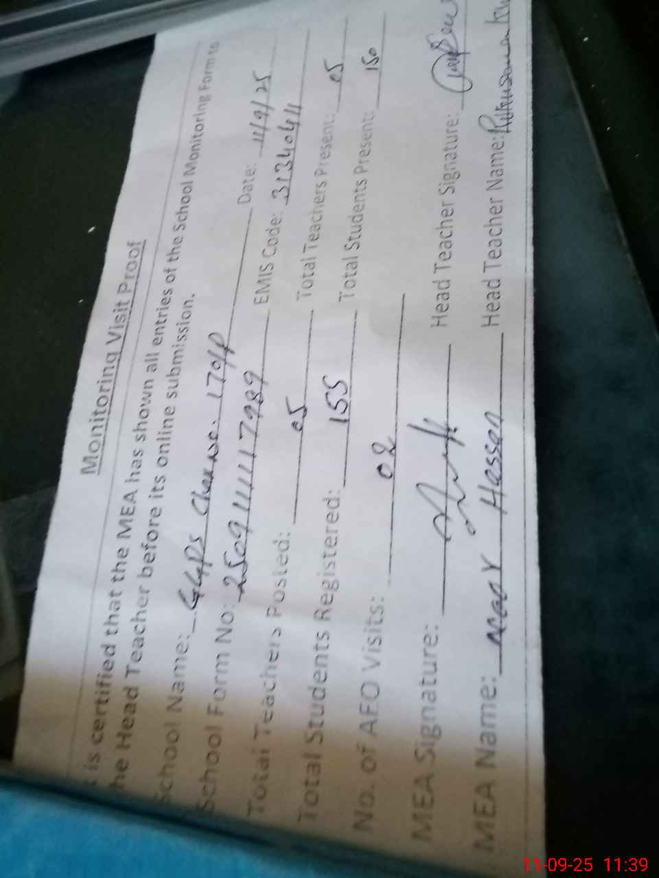 | Attendance Register | Head Teacher | MEA with School | Visit Proof |