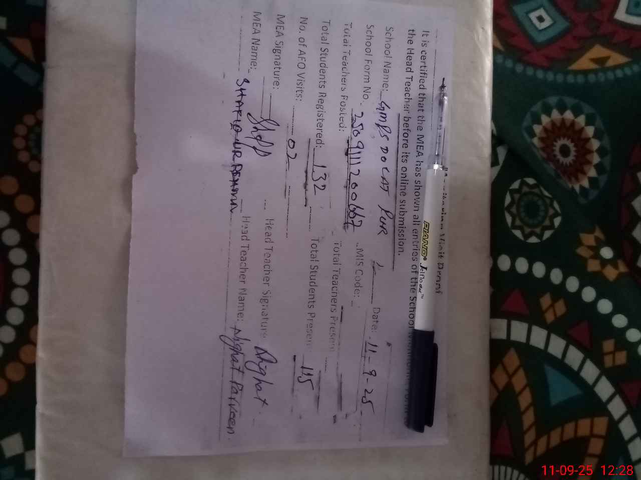 | Attendance Register | Head Teacher | MEA with School | Visit Proof |