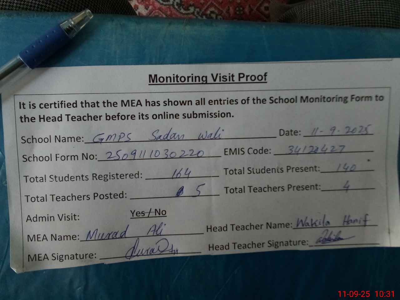 | Attendance Register | Head Teacher | MEA with School | Visit Proof |