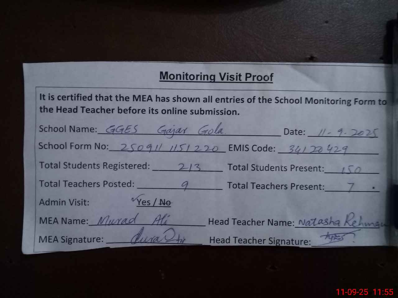| Attendance Register | Head Teacher | MEA with School | Visit Proof |