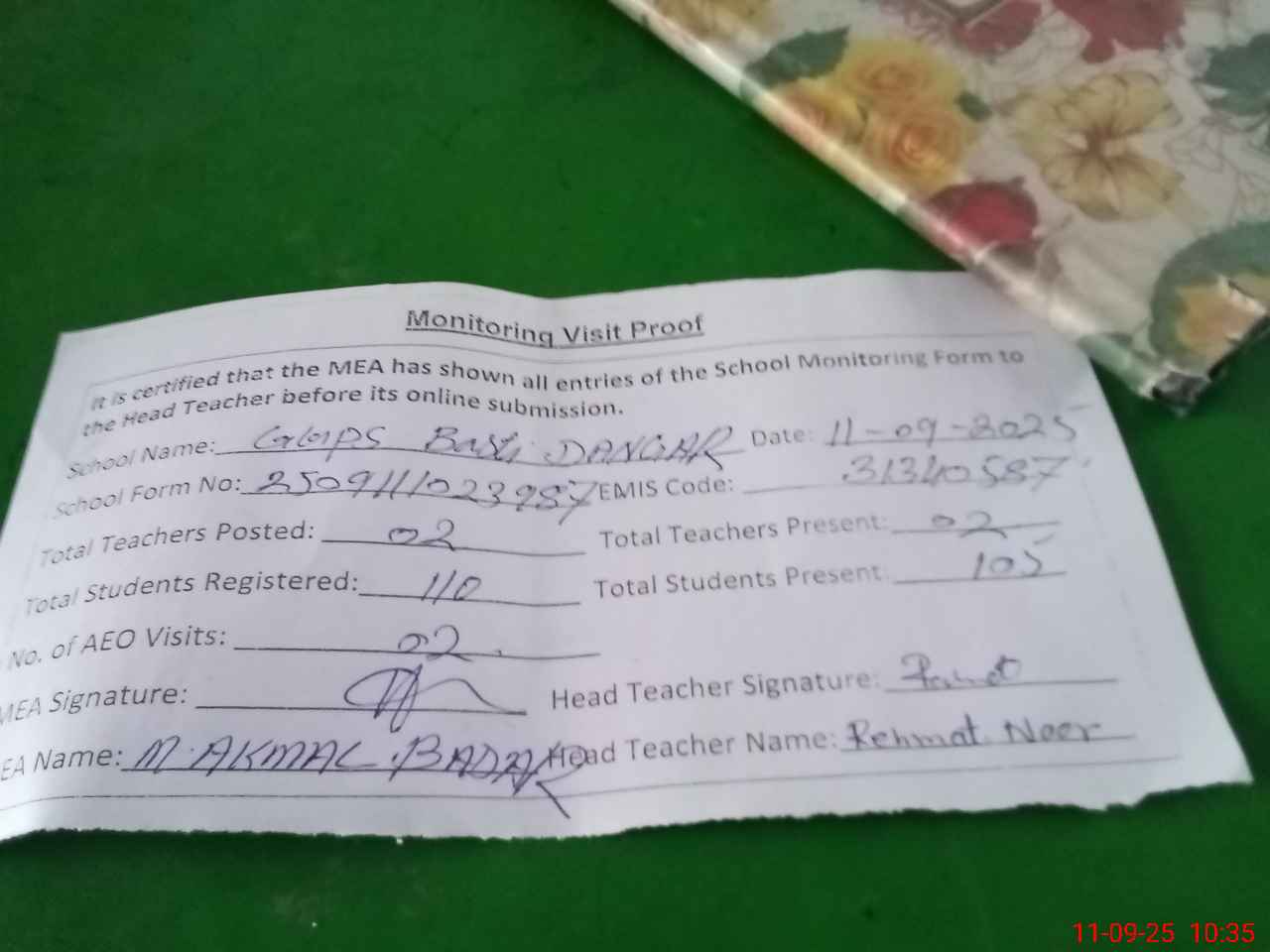 | Attendance Register | Head Teacher | MEA with School | Visit Proof |