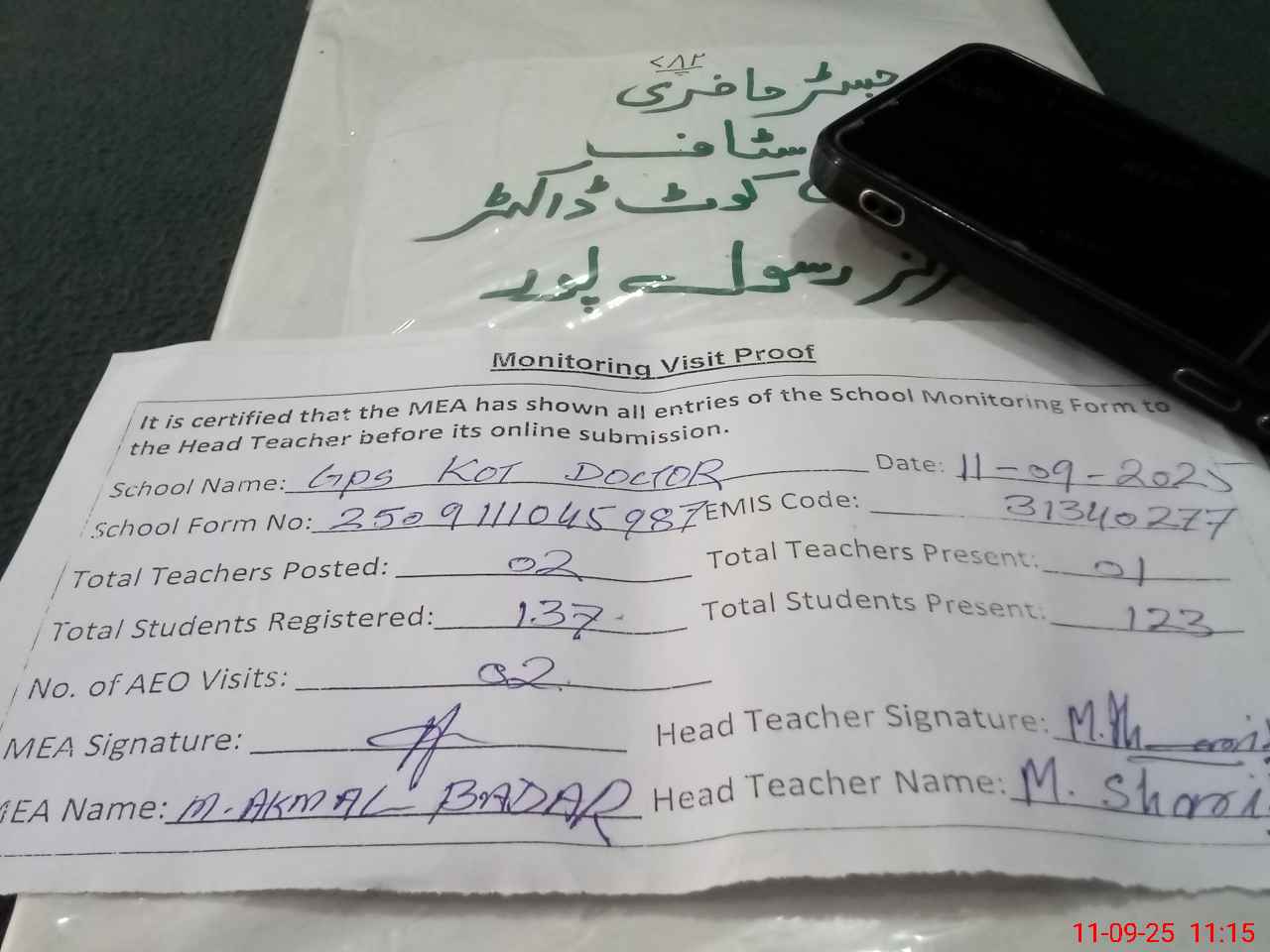 | Attendance Register | Head Teacher | MEA with School | Visit Proof |