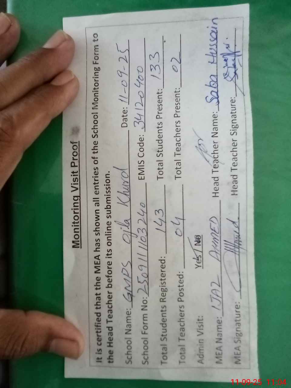 | Attendance Register | Head Teacher | MEA with School | Visit Proof |