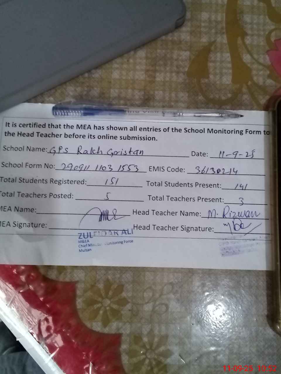 | EMIS Code: 36130214 | Name of School: GPS RAKH GRISTAN ABAD MAKHDUM RASHEED MULTAN | |||