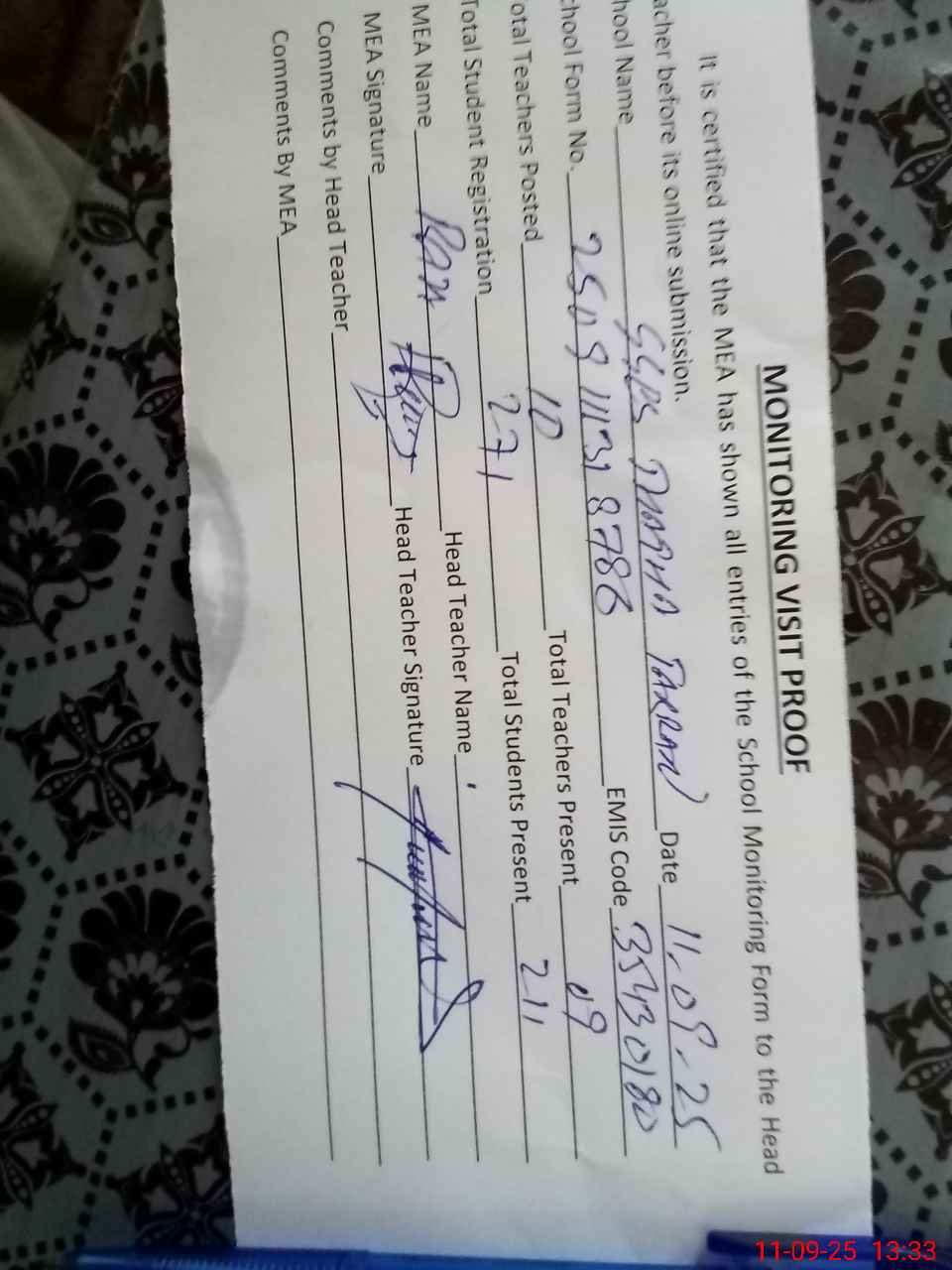 | Attendance Register | Head Teacher | MEA with School | Visit Proof |