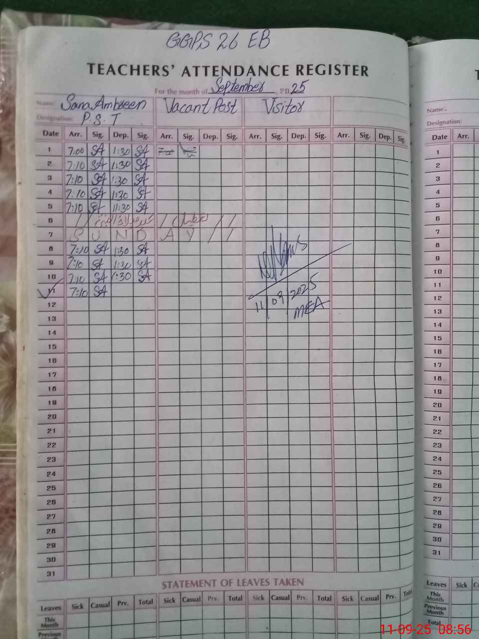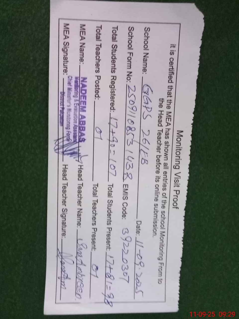 | Attendance Register | Head Teacher | MEA with School | Visit Proof |
