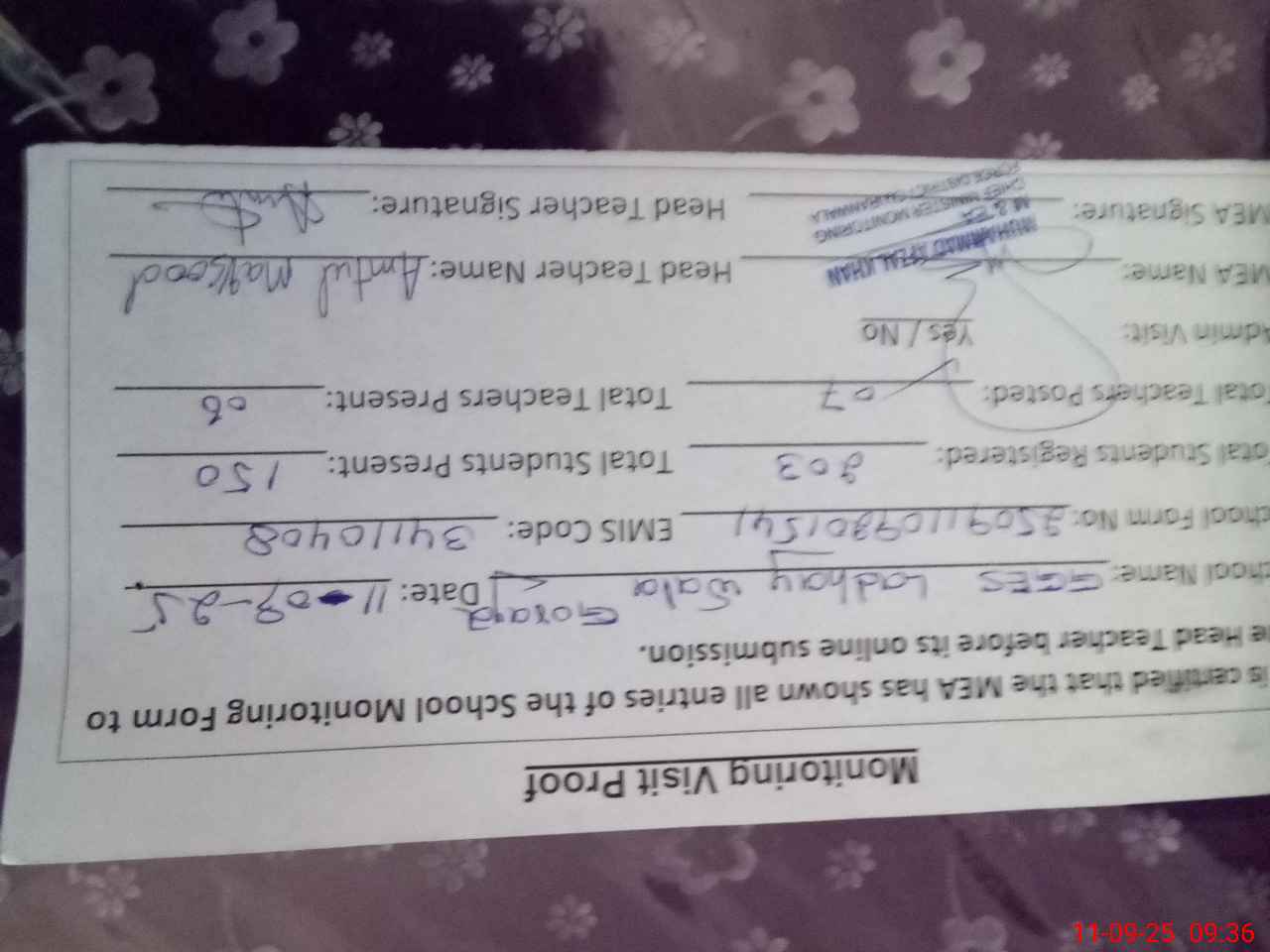 | Monitoring Date: 11-09-2025 | Start Time: 11-09-2025 08:50 AM | End Time: 11-09-2025 09:40 AM | Name of MEA: N-**** Af**** Kh**** | |