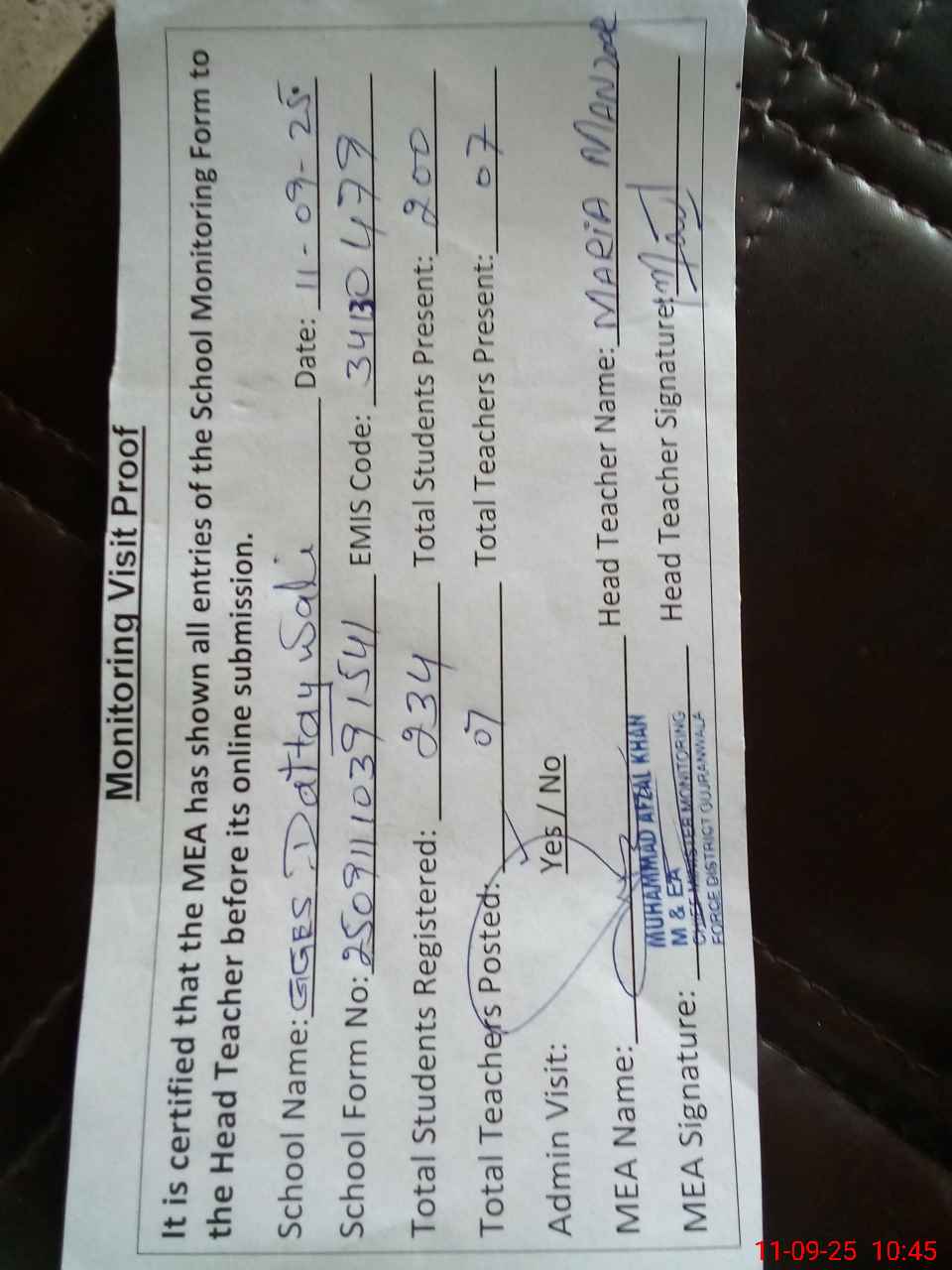 | Attendance Register | Head Teacher | MEA with School | Visit Proof |