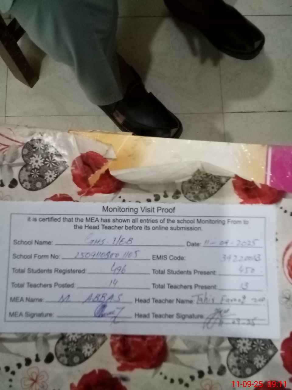 | Attendance Register | Head Teacher | MEA with School | Visit Proof |