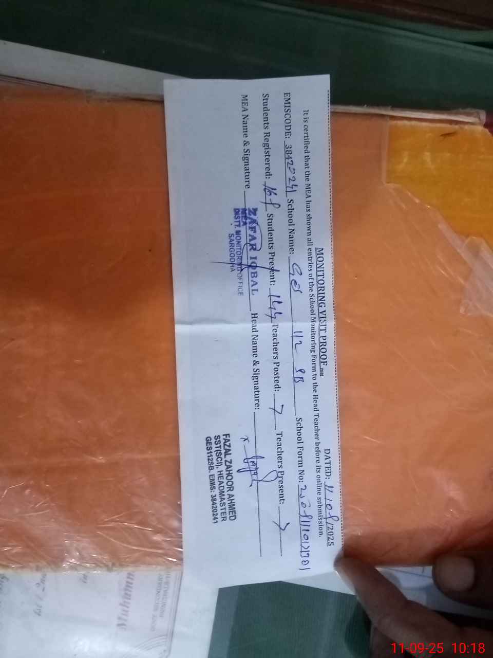 | Monitoring Date: 11-09-2025 | Start Time: 11-09-2025 09:51 AM | End Time: 11-09-2025 10:19 AM | Name of MEA: ZA**** IQ**** | |