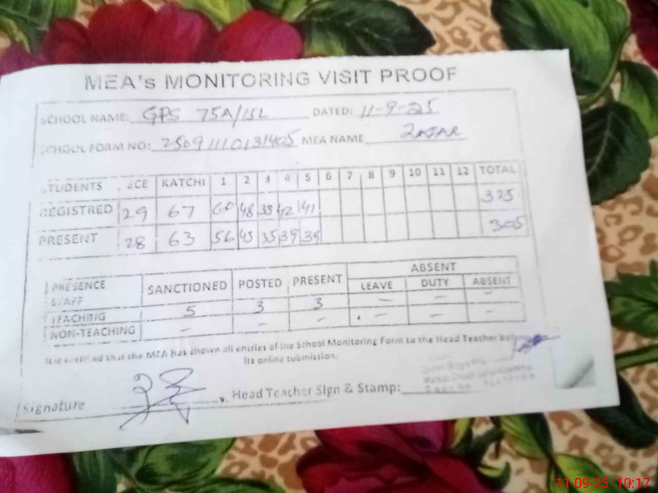 | Attendance Register | Head Teacher | MEA with School | Visit Proof |