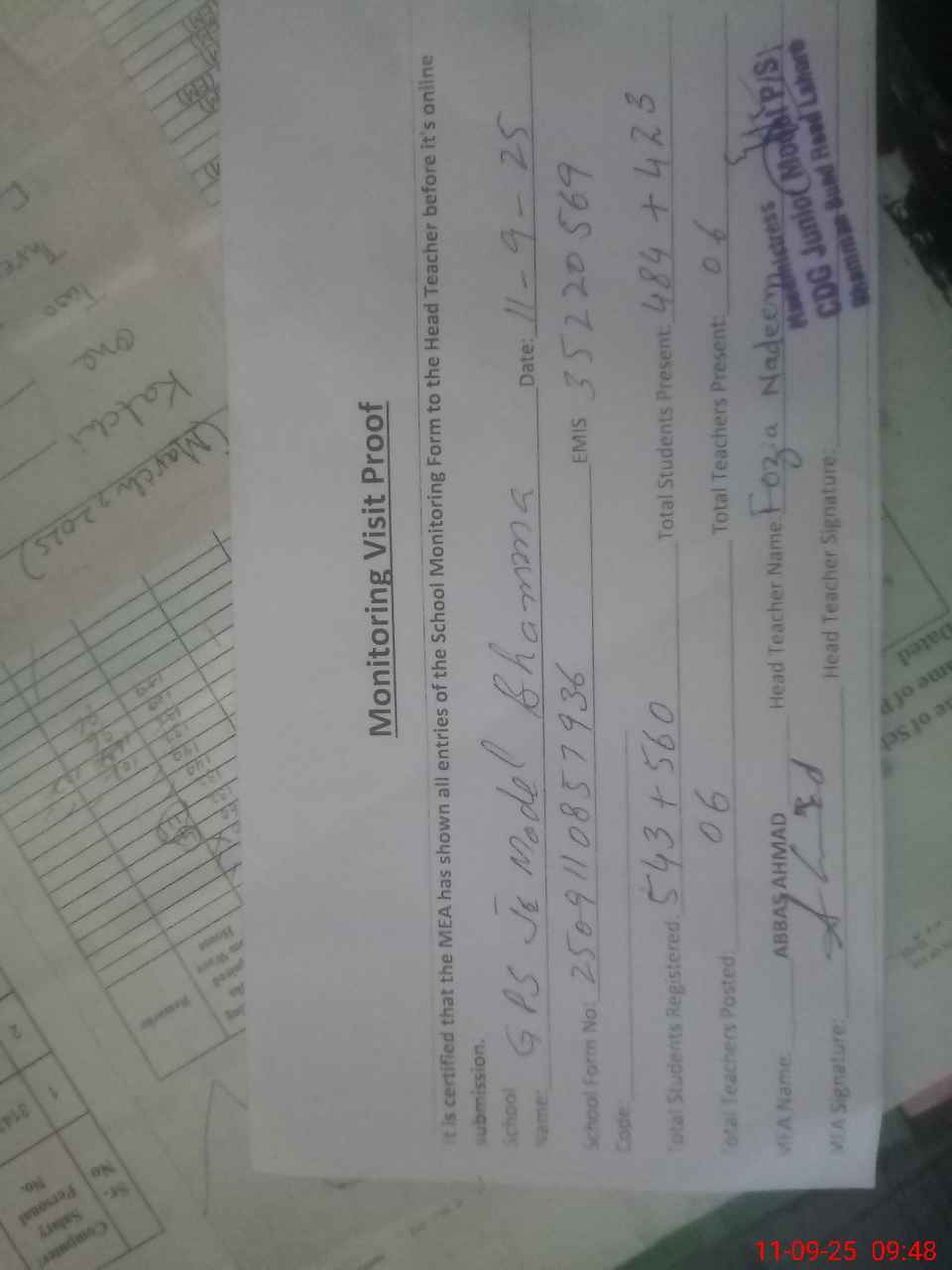 | Attendance Register | Head Teacher | MEA with School | Visit Proof |